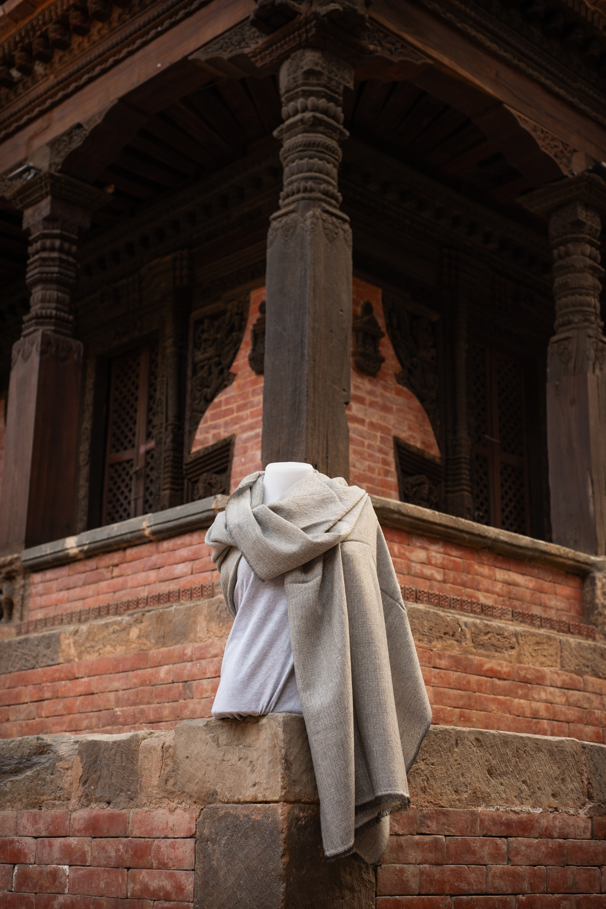Experience conscious luxury with this extraordinary vegan cashmere shawl, meticulously crafted by master artisans in Nepal. This refined piece showcases an elegant two-tone gray palette and a fine, understated chevron texture, creating a sophisticated accessory that embodies both timeless elegance and ethical craftsmanship.